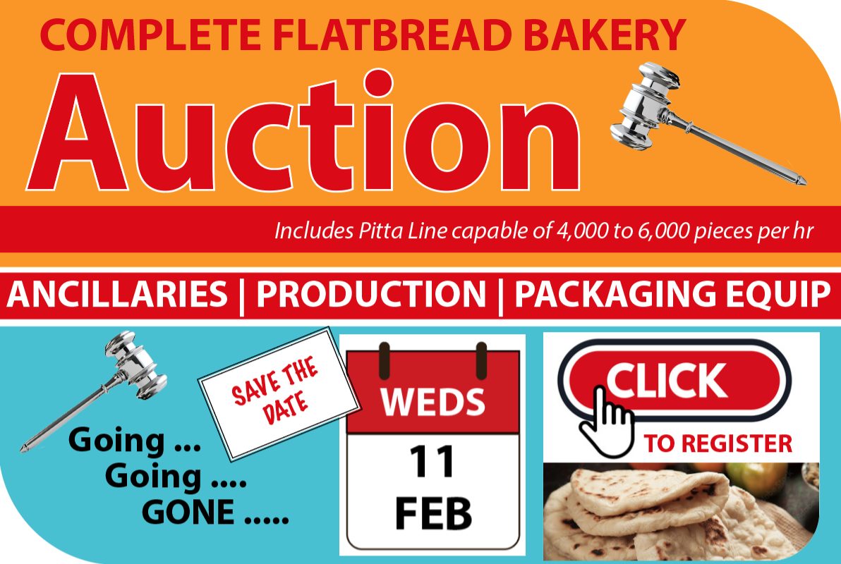 AUCTION OF FOOD PROCESSING AND PACKING EQUIPMENT DUE TO THE CLOSURE OF A FLATBREAD BAKERY. INCLUDES COMPLETE PITTA BREAD LINE.